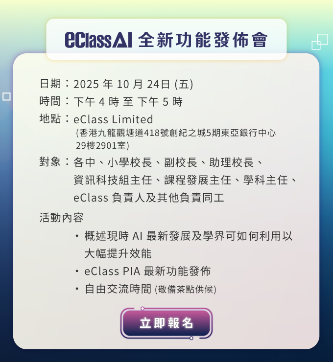 我們將於發佈會中公佈更多有關 eClass PIA 的升級功能,現誠邀各中、小學同工出席是次發佈會,名額有限,敬請報名從速!