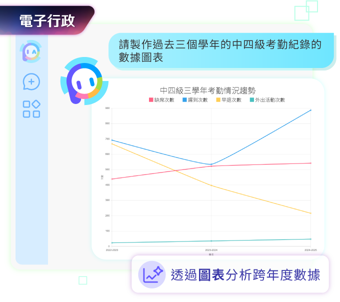 早在 AI 技術逐漸普及之前,eClass 已積極探索如何將這項嶄新科技應用於教育領域,協助學校利用前沿技術減輕繁重的校務負擔。憑藉二十多年與香港學界合作的經驗,我們持續研發既符合學校需求,又能保障資料私隱的 AI 服務,並於2023年中成功推出 eClass AI 方案,透過 JustChat 功能讓同工直接與 AI 對話,加快處理各項工務,並將 AI 深度整合至 eClass 各大模組中,實現對平台內數據的深入分析及整理。隨後,在2024年初我們更推出了專為學界而設的 AI 助手 — eClass PIA,協助同工輕鬆應對各類行政及教學工作,帶動眾多學校逐步建構 AI 校園。